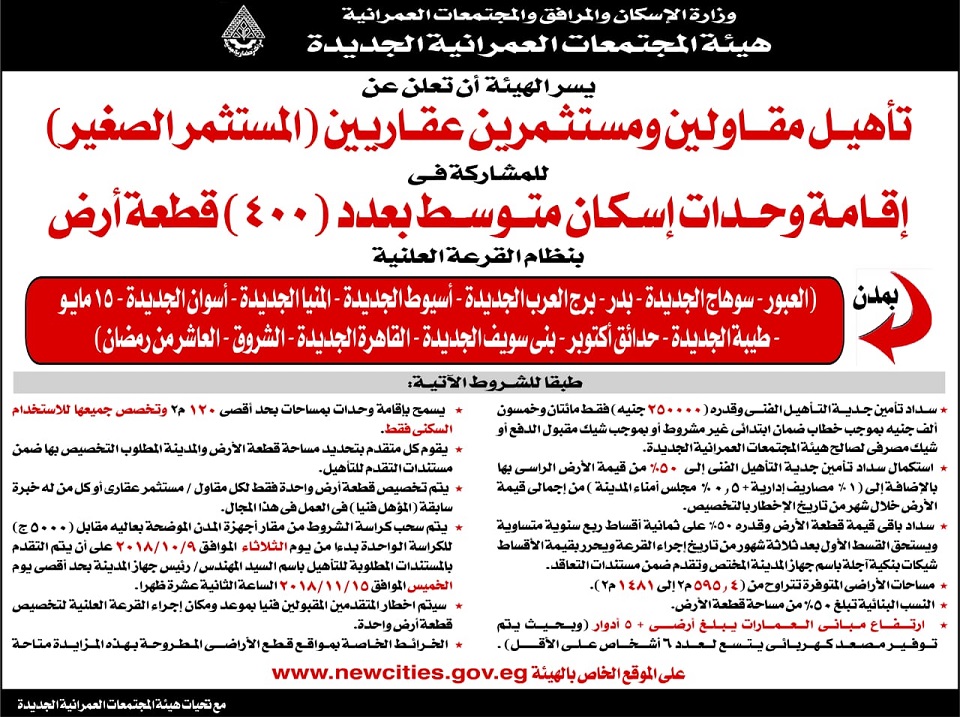 هيئة المجتمعات العمرانية الجديدة 2018. وزير الإسكان ومحافظ مطروح يتابعان الخطوات اللازمة لبدء تنفيذ المشروعات المختلفة بمدينة رأس الحكمة الجديدة طرح عدد 4 وحدات مهنية وإدارية للبيع بالمزاد العلنى بمدينة الفيوم الجديدة. مساعد نائب رئيس هيئة المجتمعات العمرانية يتفقد مشروع الإسكان الاجتماعى ومحطتي محولات كهرباء بمدينة بدر 2020. البدء فى إجراءات التخصيص بالمرحلة الخامسة التكميلية إعتبارا من يوم الأحد الموافق 14 1 2018 وفقا لشروط المرحلة الخامسة التكميلية والمعتمدة من مجلس الوزراء بجلستة رقم 97 بتاريخ 22 11 2017 وفقا لأولوية التحويل طبقا لكشف الوارد من البنك المركزى على النحو التالى. تفاصيل اعلان هيئة المجتمعات العمرانية الجديدة طرح الأراضى السكنية والاستثمارية وأراضي الخدمات و100 الف وحدات السكنية جديدة لعام 2018 2019 تعرف عليها.