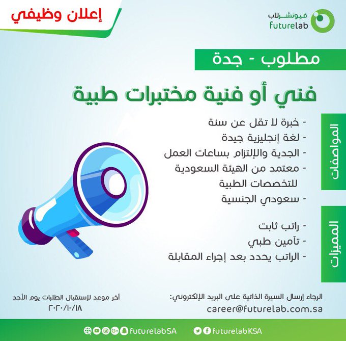 وظائف شاغرة في كبري المراكز الطبية بالمملكة العربية السعودية الرياض لتخصص اخصائيين اشعة وفنيين مختبرات من الجنسين للسعوديين وجميع الجنسيات العربية والمزيد من. أعلنت مختبرات فيوتشرلاب توفر وظائف مختبرات طبية للجنسين للعمل بمحافظة جدة بمسمى فني فنية مختبرات طبية واشترطت الشركة أن تكون المتقدمة سعودية الجنسية وذلك وفقا لبقية الشروط والتفاصيل الموضحة أدناه. فنى معمل تحاليل طبية السلام عليكم. ترسل السيرة الذاتية إلى البريد الإلكتروني التالي مع كتابة مسمى الوظيفة في عنوان البريد.